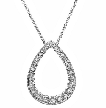 Total Carat Weight: Diamond weight 0.20ctw This elegant 18k white gold pendant features a tear drop design with pavé diamonds framed by hand milgrain. Available in 14k or 18k White, Rose or Yellow Gold And Platinum