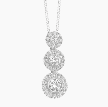 Total Carat Weight: Diamond weight 0.23ctw With charming sophistication, this mesmerizing 18K white gold pendant features a three stacked circles each with a center bezel set diamond surrounded by melee diamonds Available in 14k or 18k White, Rose or Yellow Gold And Platinum.