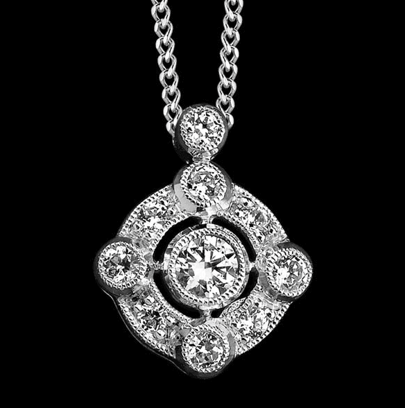 Total Carat Weight: 0.25ctw of diamonds With shimmering details, this vintage-inspired 18k white gold pendant features a center bezel-set diamond surrounded by more diamonds with milgrain detailing. Available in 14k or 18k White, Rose or Yellow Gold And Platinum.