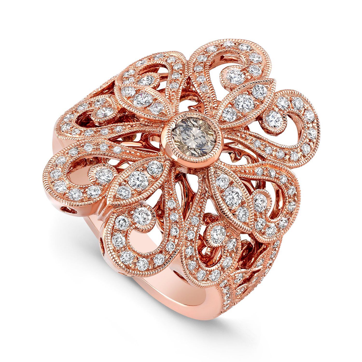 Total Carat Weight (center stone cognac diamond .23CT) diamond weight .67tcw With captivating elegance, this gorgeous 18k rose gold ring features a floral motif with a 4.0RD center cognac diamond and diamond accents. Available in: 14K or 18K White Gold, Rose Gold, Yellow Gold And Platinum.
