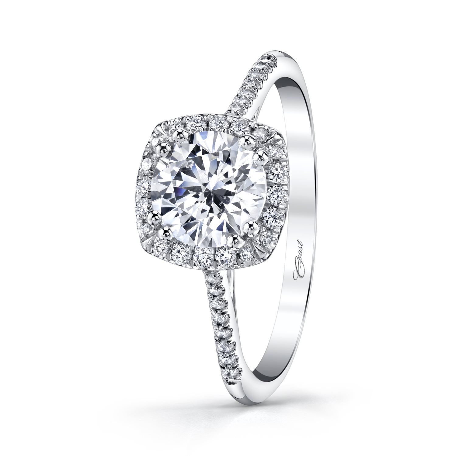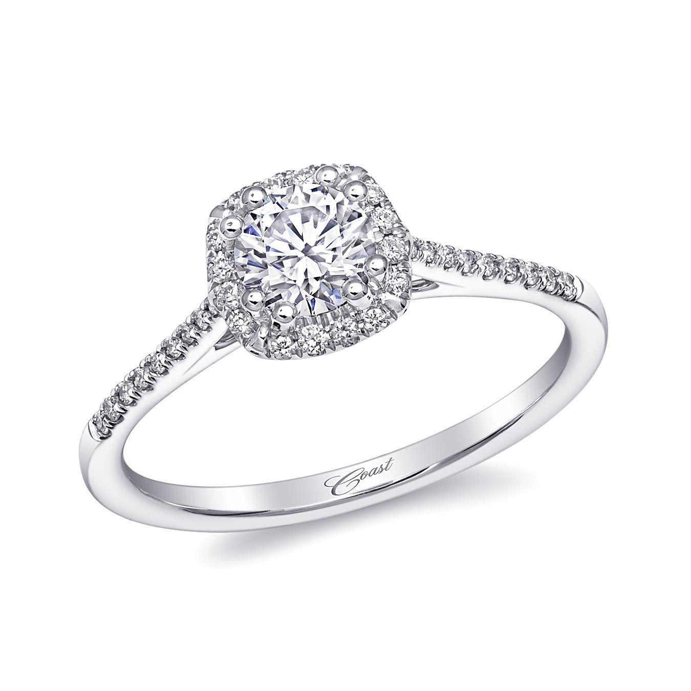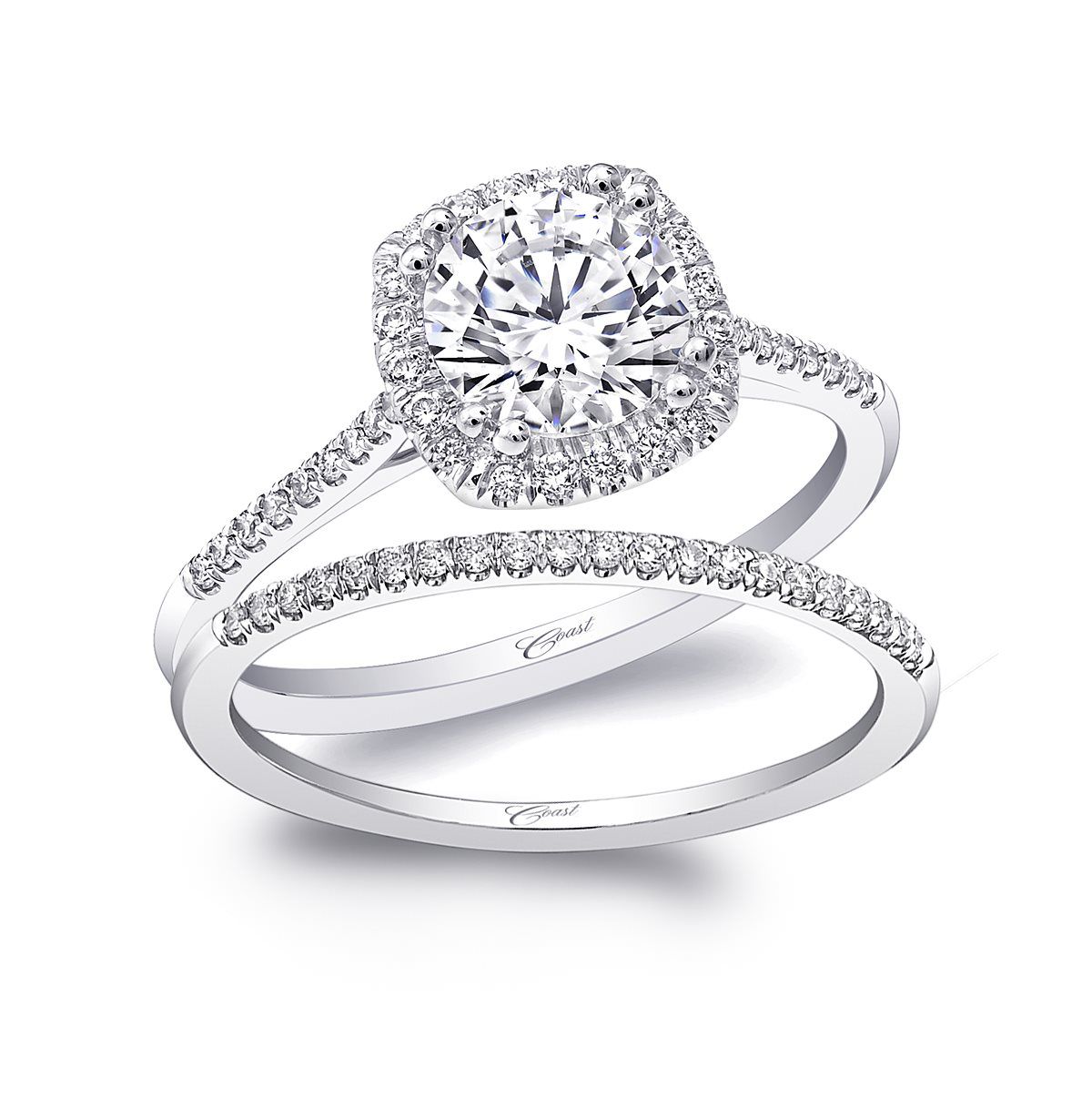 This petite engagement ring design features a cushion shaped halo and diamonds on the shoulders of the ring. And matching petite diamond band.