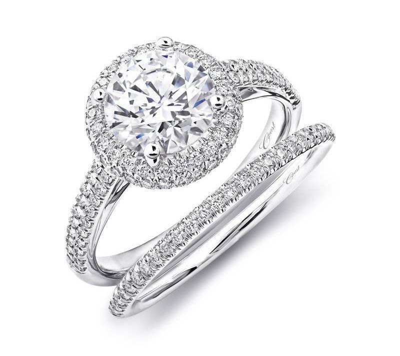 A bold and beautiful round halo frames the center stone on this captivating design. Multiple rows of diamonds on the shank add to the allure. A matching diamond band completes the look.
