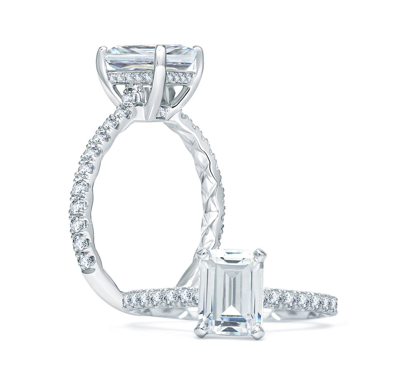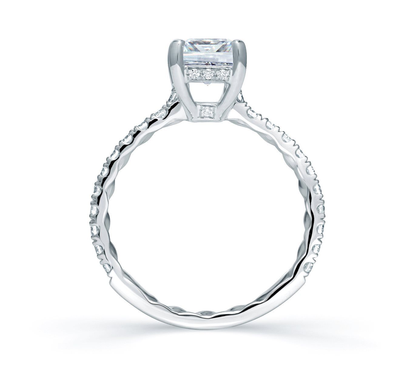 From the Quilted Collection, this beautiful French pave engagement ring features an emerald cut center stone and additional pave diamond detail on the head.